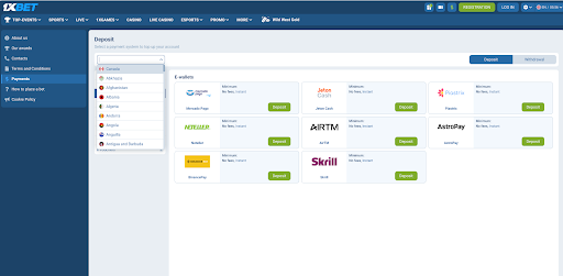 1xBet online offers casino and sports betting Canada players speedy and secure payment options to help players seamlessly move money in and out of the gaming hall. All accepted deposit methods offer instant transactions, whereas the time it takes for your cashouts to be processed varies across withdrawal methods.